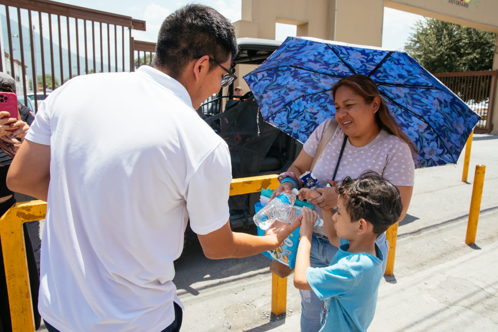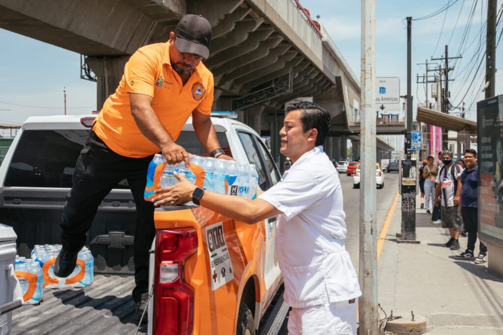 Este miércoles personal de Protección Civil municipal en conjunto con la Secretaría de Salud y Participación Ciudadana distribuyeron más de 2 mil botellas de agua fresca y repartieron suero oral, e incluso atendieron personas que registraron agotamiento físico.