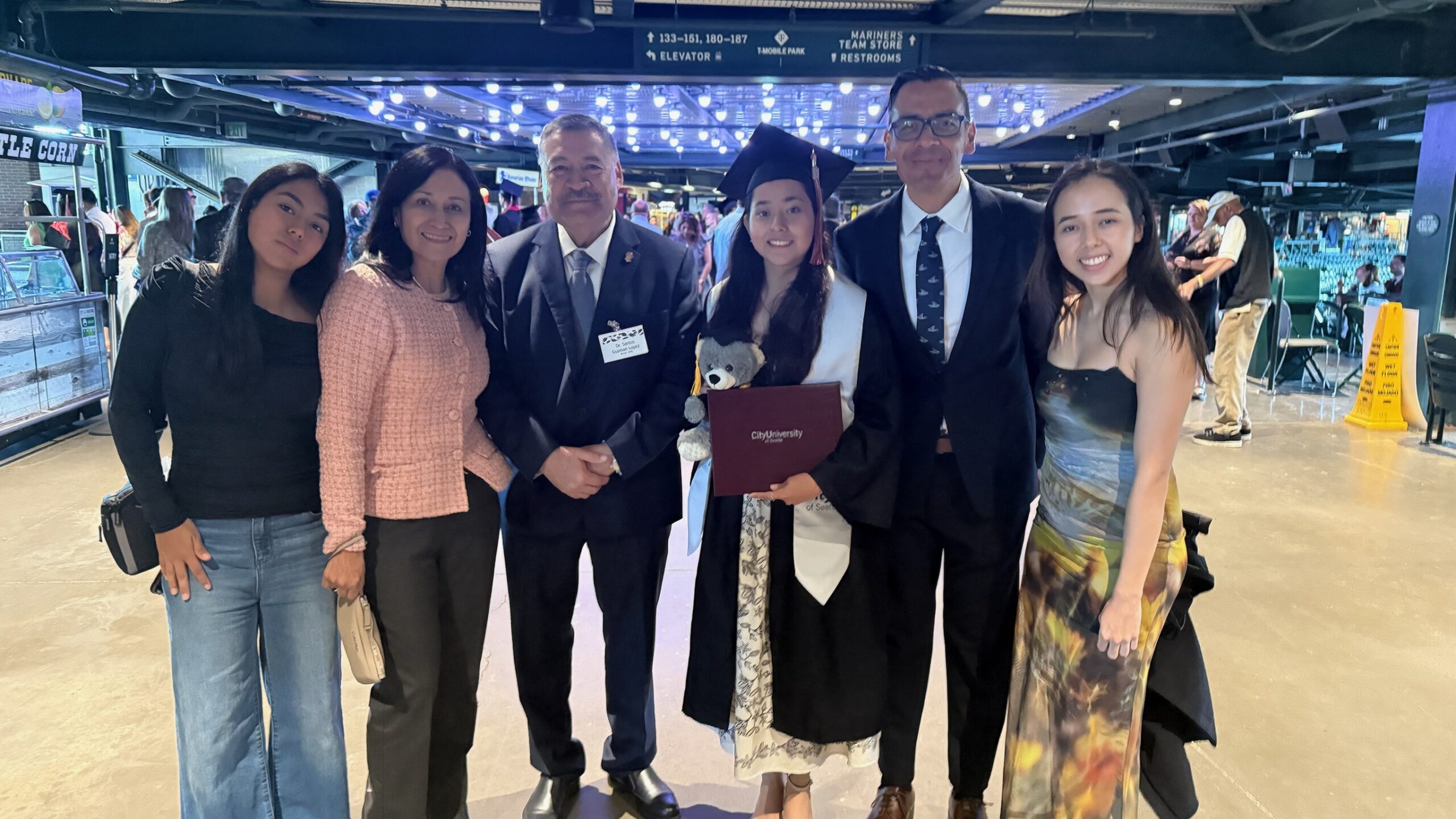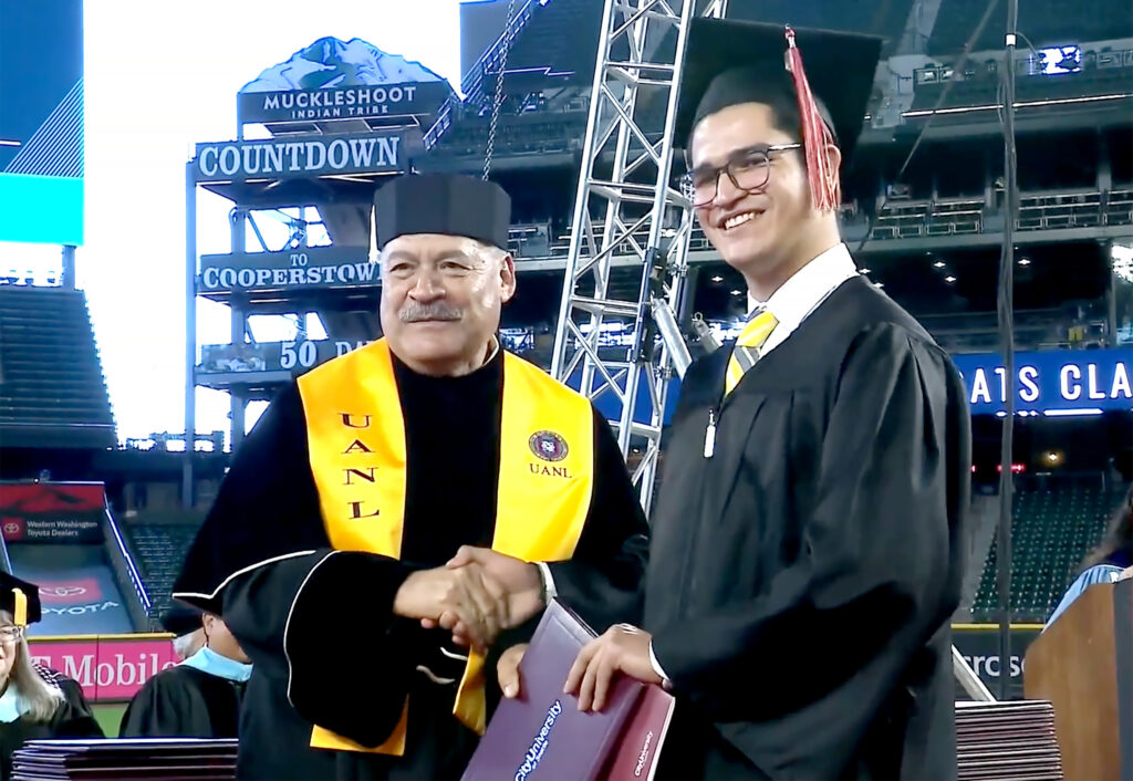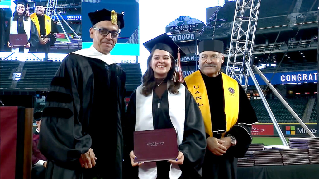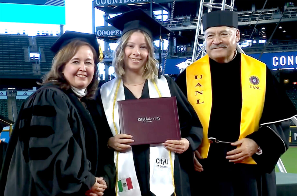 El Rector de la UANL, Santos Guzmán López, la coordinadora de la Facultad de Contaduría Pública y Administración, Adriana Garza Elizondo, y el director de la Facultad de Psicología, Mario Alberto Loredo Villa, estuvieron presentes durante la quincuagésima ceremonia de graduación de la CityU efectuada el 7 de junio en el T-Mobile Park de Seattle.
