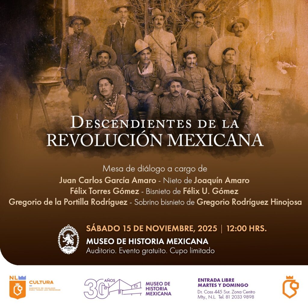 La charla “Descendientes de la Revolución Mexicana”, se realizará el sábado 15 de noviembre a las 10:30 horas en el Auditorio del Museo del Noreste con entrada libre. Para más información, consulte www.3museos.com póngase en contacto a través de las redes sociales en @3museos.